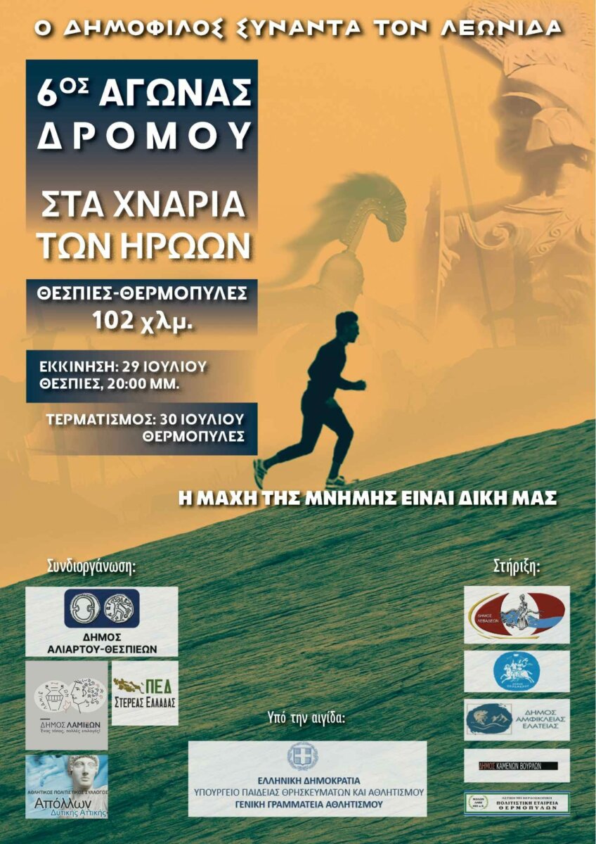 Ο 6ος αγώνας δρόμου “ΣΤΑ ΧΝΑΡΙΑ ΤΩΝ ΗΡΩΩΝ” ΘΕΣΠΙΈΣ -ΘΕΡΜΟΠΥΛΕΣ, 102 χιλιόμετρα θα διεξαχθεί το ερχόμενο Σάββατο 29/7/2023 και τον αφιερώνουμε στους ήρωες που πέφτουν σε κάθε μάχη με αυτοθυσία, όπως ακριβώς οι 700 Θεσπιείς.