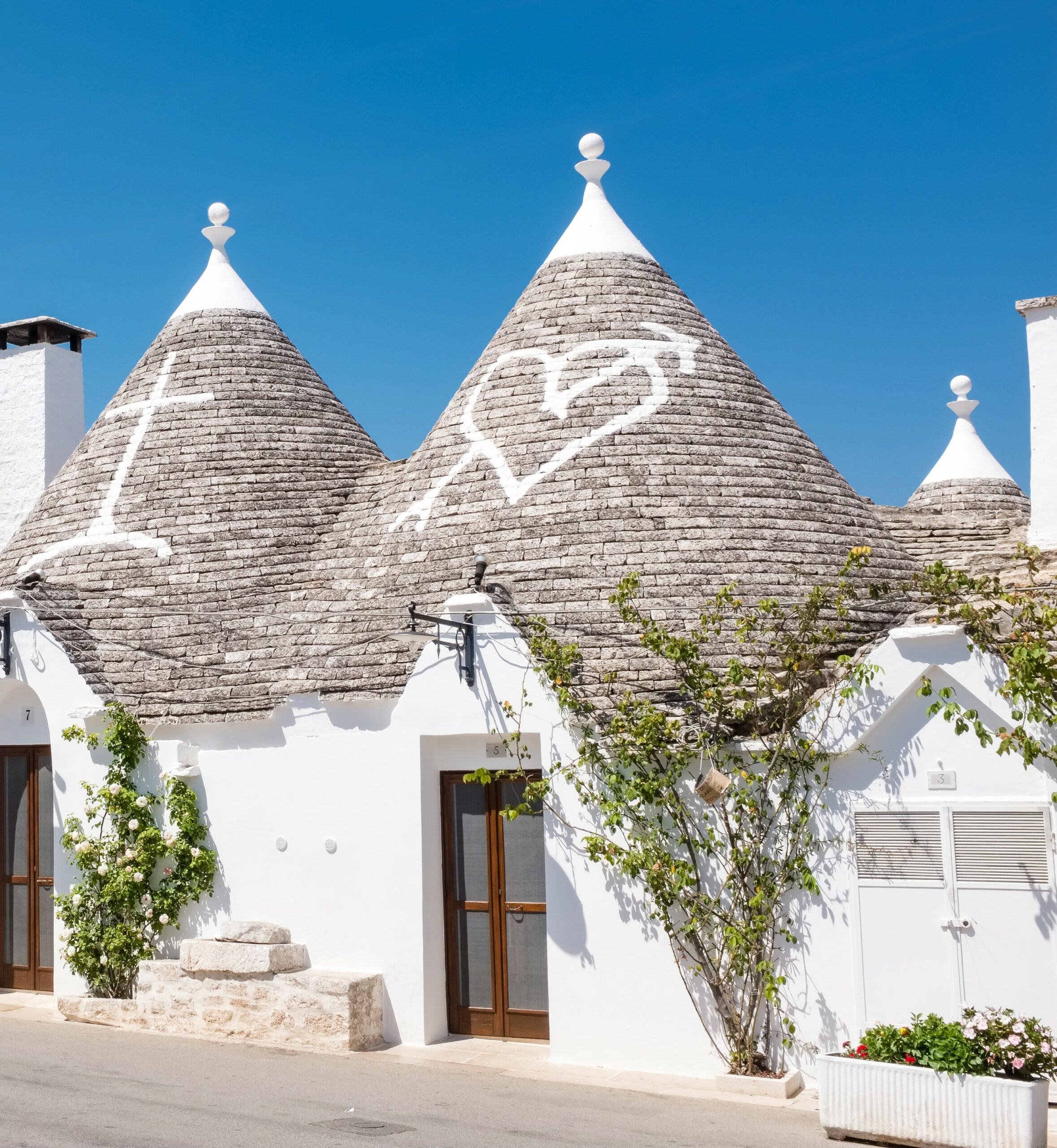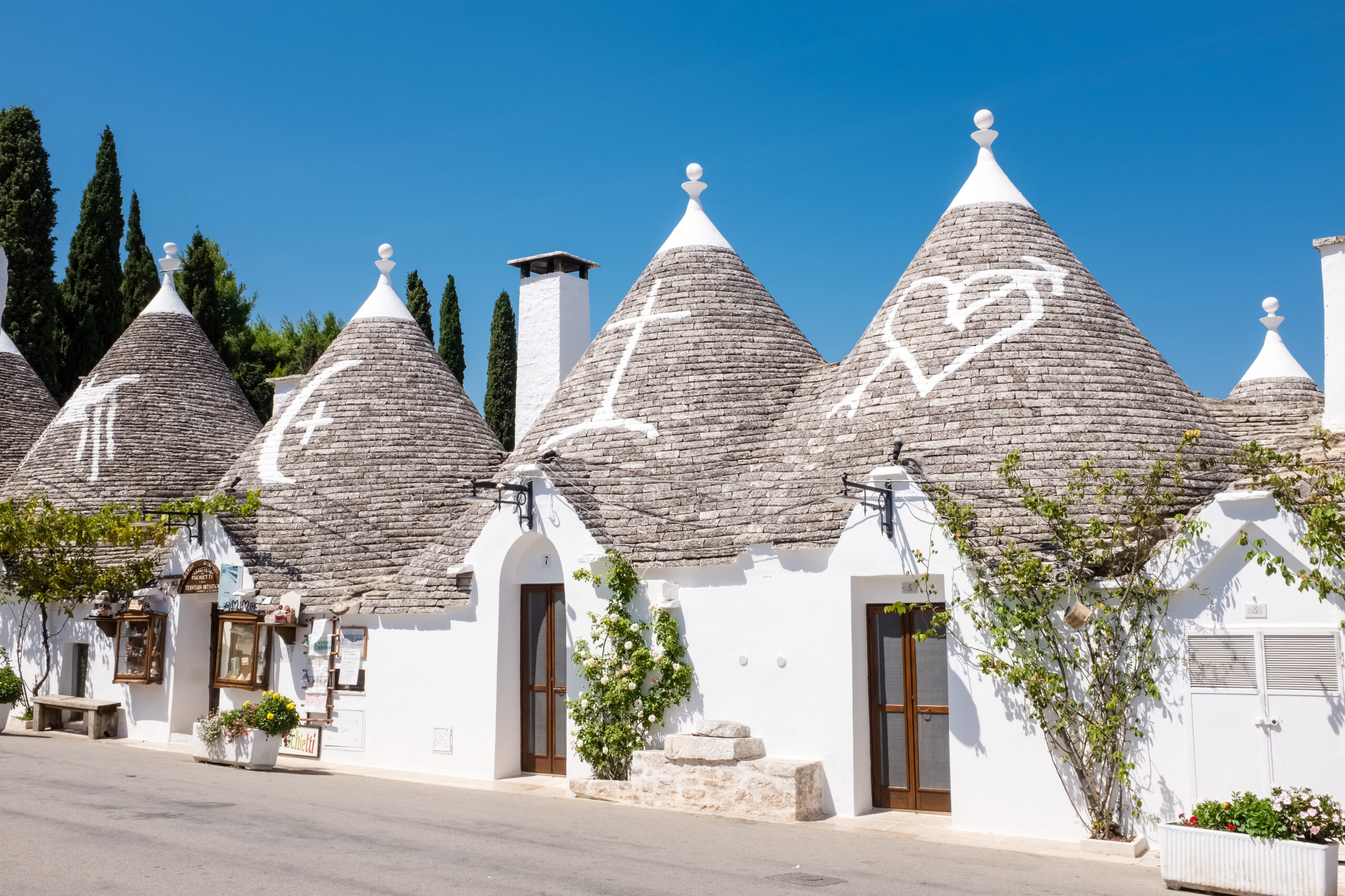 Τα ασβεστωμένα σπίτια που μοιάζουν να φορούν τα γκρίζα, πέτρινα σκουφιά τους μπορεί κανείς να τα συναντήσει και σε άλλες πόλεις της νοτιοανατολικής Ιταλίας. Στη συγκέντρωση, όμως, που βρίσκονται στο Αλμπερομπέλο, δεν θα τα δει πουθενά αλλού. Εδώ, σχεδόν 1.500 τέτοια οικήματα, φτιαγμένα από ντόπιο ασβεστόλιθο και με επιστέγασμα τους πανέμορφους κωνικούς τρούλους – trulli -, κατασκευασμένους με την παραδοσιακή τεχνική της ξερολιθιάς, μόνο από πέτρα και χωρίς τη χρήση άλλων δομικών υλικών, συνθέτουν μια εικόνα που όμοιά της δεν υπάρχει παρά μόνο στις σελίδες παραμυθιών.